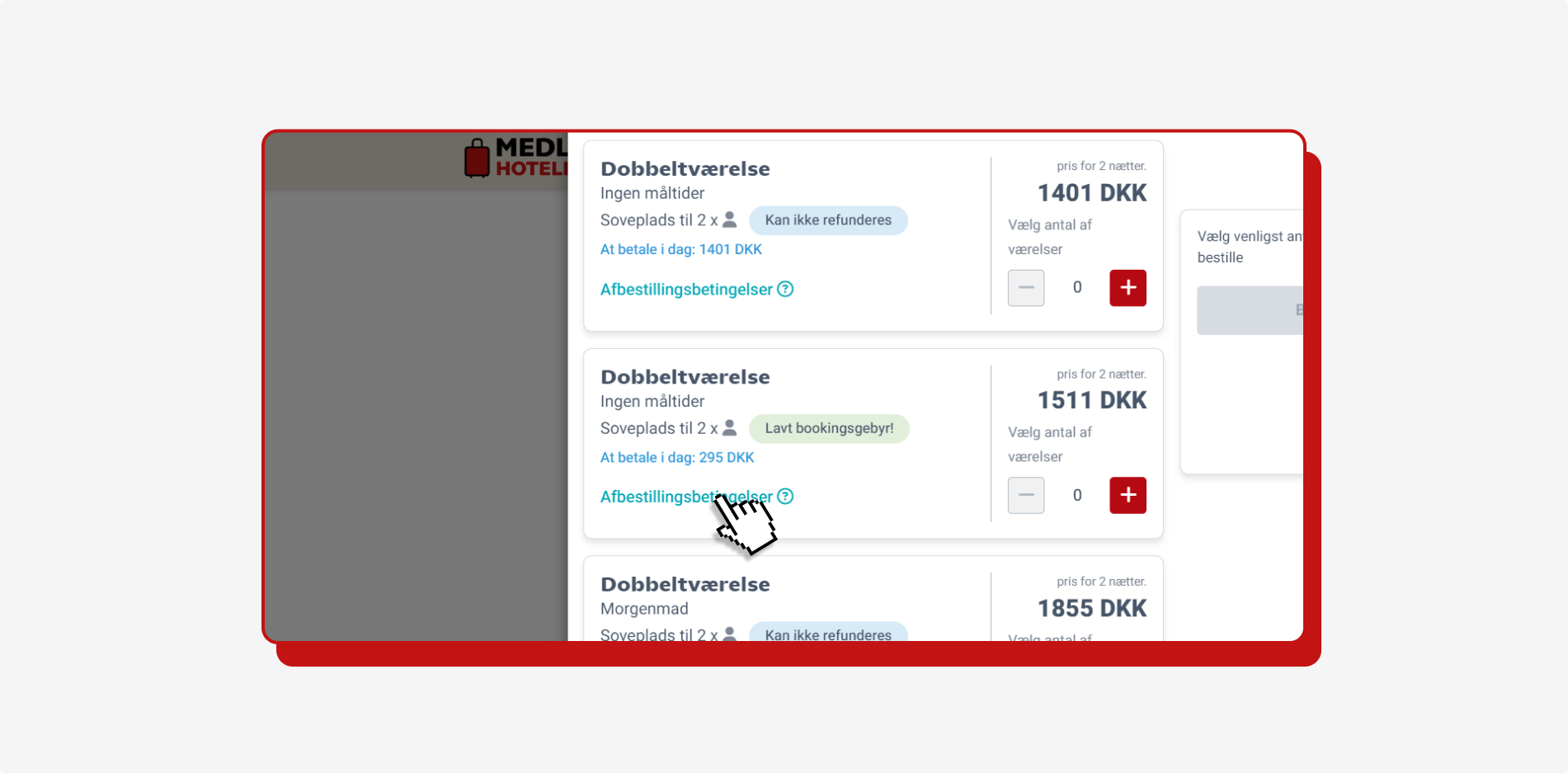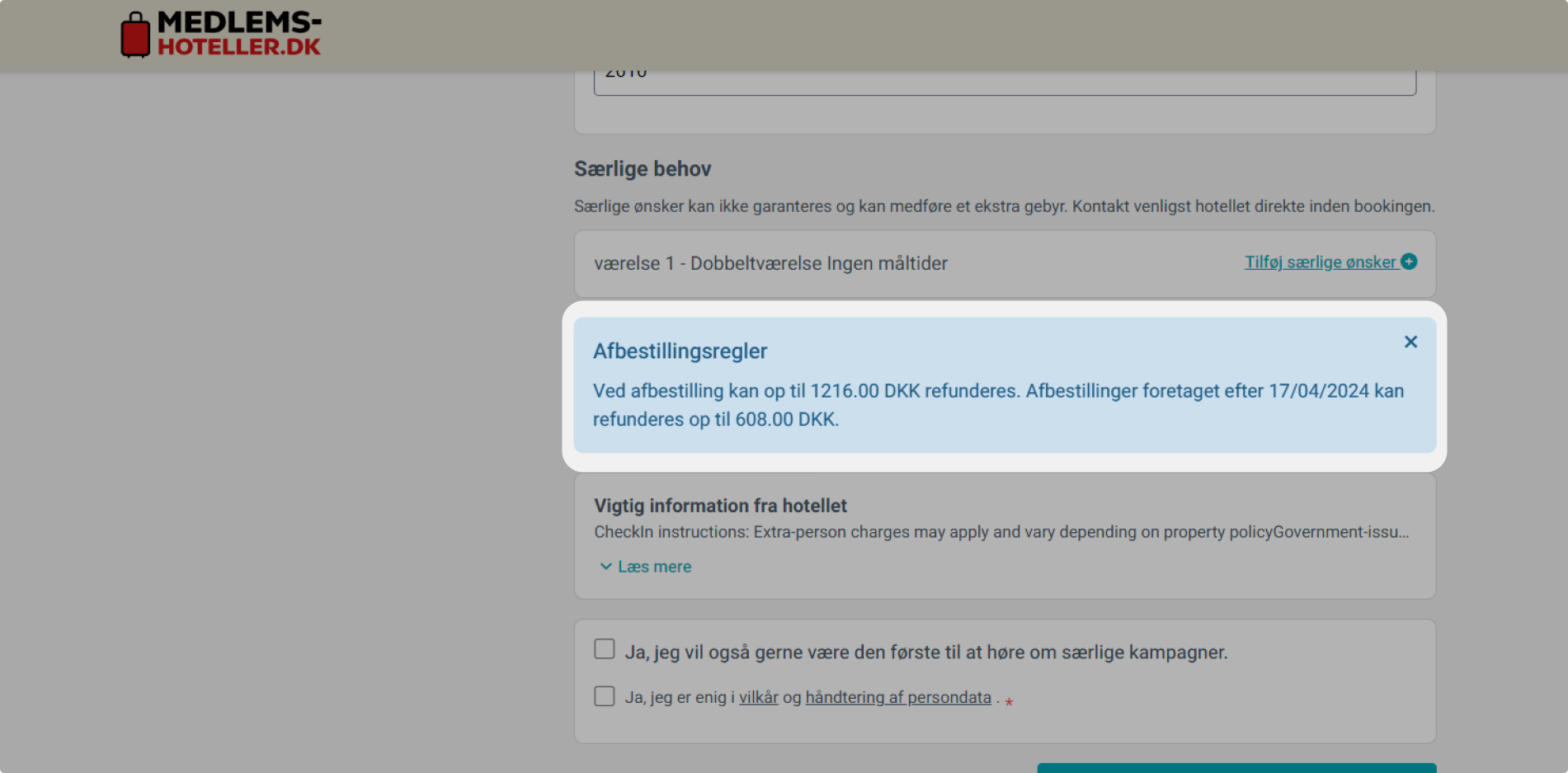 Da afbestillingspolitikken for vores partnerhoteller kan variere, er det vigtigt at sætte sig ind i de regler, der gælder for det hotel, du ønsker at booke. Som bruger af Medlemshoteller.dk er du selv ansvarlig for at læse og forstå de vilkår og betingelser, som det enkelte overnatningssted oplyser under bookingprocessen. Du kan læse mere om vores vilkår her