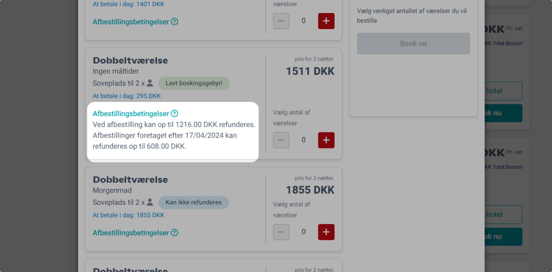 2. Hold musen over "Afbestillingsregler" for at se de regler, der gælder for det hotelværelse, du er interesseret i.