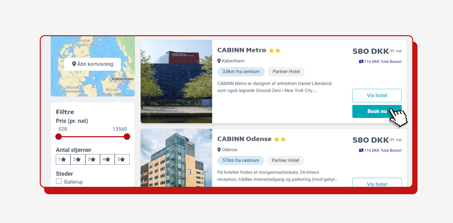 Når du booker et af vores partnerhoteller, vil du blive opkrævet det fulde beløb for dit ophold på bookingtidspunktet.